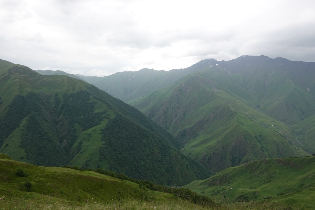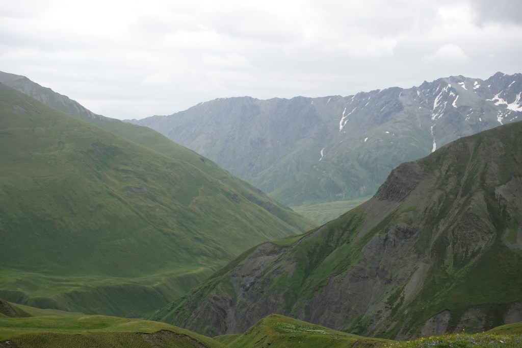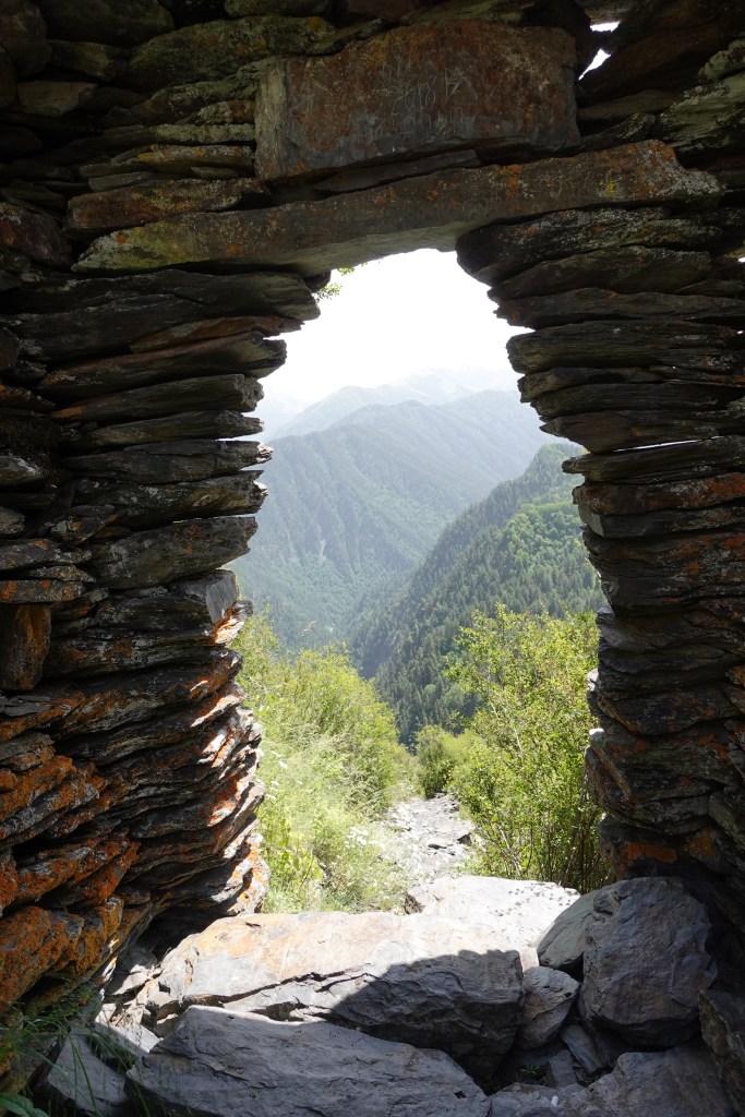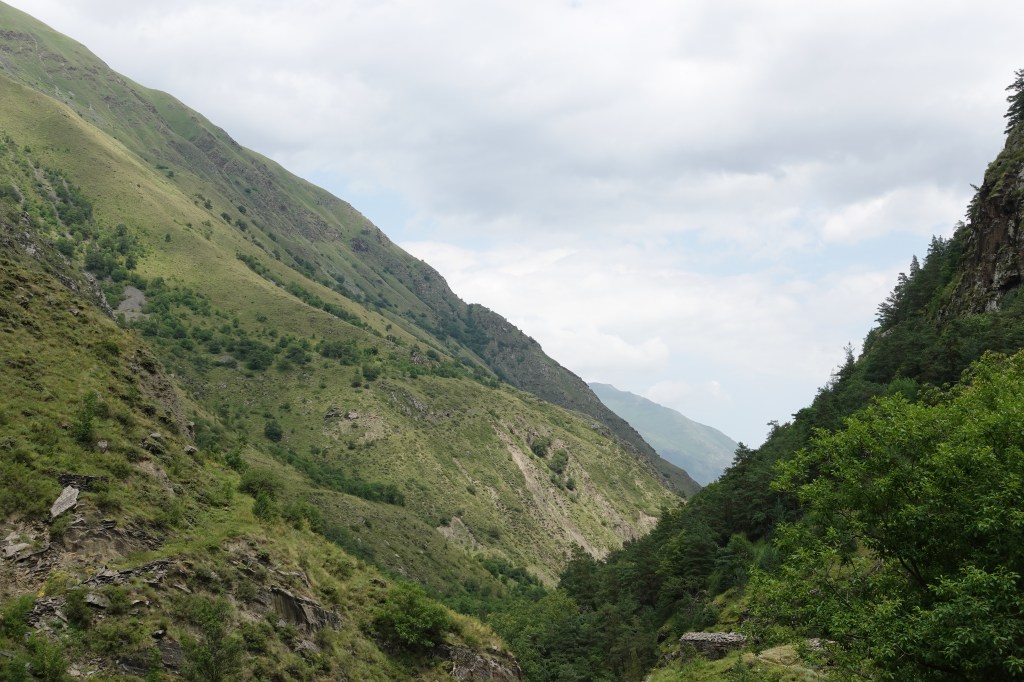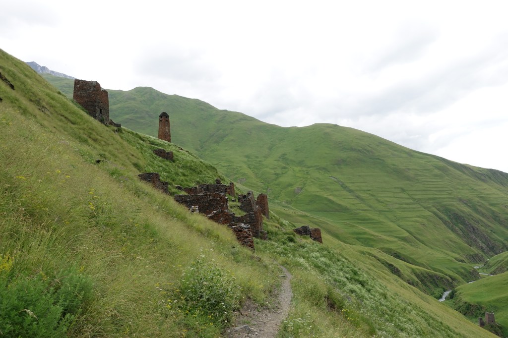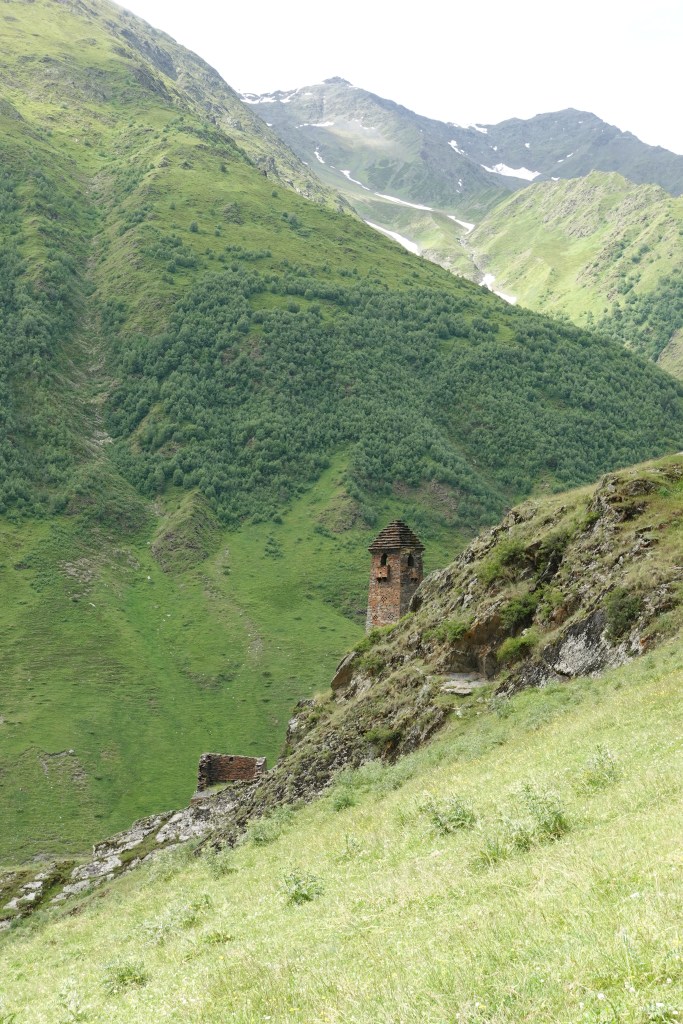 The landscapes of Tusheti and Khevshureti seemed wilder than those of Svaneti, but at the same time the peaks felt somehow less threatening. The people were certainly just as welcoming as the Svans: take the example of the man who drove me over the pass into Tusheti, who spontaneously invited me to his house for lunch before we set off, or the border police officer who, having had me fill in his forms, was very keen for me to meet his giant pet rabbit. On the last day, as I approached the fortified settlement of Shatili, I passed a group of young Georgian hikers who were brewing up beside the path, and they invited me to have some coffee with them (they offered me tea instead when I told them I was from England, of course…). We got talking and it turned out they were also going as far as Shatili that day, so we hiked the final 10km together. They were very keen I should learn some Georgian along with my Russian (I’m trying, I promise!), and it struck me how adamant they all were that they wanted to dedicate their careers post-graduation to the service of their own country, rather than looking for work abroad.